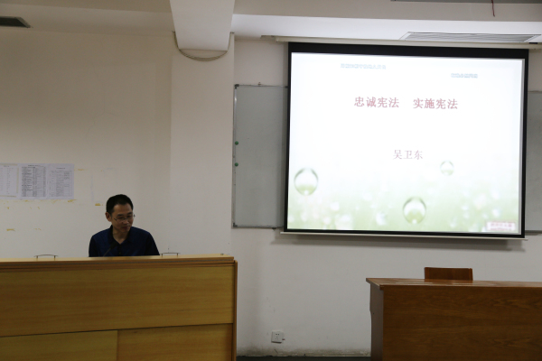 按照“两学一做”学习教育和全市法治单位创建活动相关文件要求,9月9日,我校综合教研室主任吴卫东教授为全体教职工讲授了《忠诚宪法 实施宪法》专题课,吴教授从强化宪法意识、根植宪法精神、坚定法治信仰等方面,深入解读《宪法》精神。之后,又组织大家观看了严肃换届纪律、净化换届风气的警示教育片——《镜鉴》。通过此次专题学习,有效提升了教职工的法治理论知识,增强了自觉遵守法律,弘扬法治精神的意识。 (市委党校普法办陈松松、黄月慧)