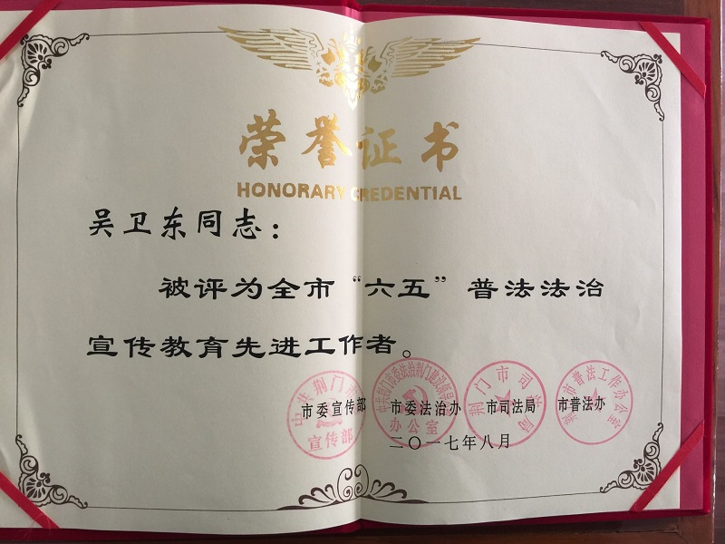 日前,从市普法办传来喜讯,我校吴卫东教授获评“六五”普法法治宣传教育先进工作者。