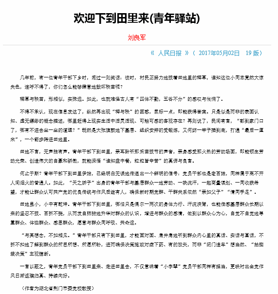 我校经管教研室主任刘良军教授在《人民日报》2017年5月2日第19版发表言论文章《欢迎下到田里来》,这是刘良军教授今年第二次在《人民日报》发表理论言谈类文章。 (市委党校科研处)